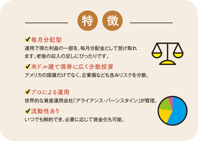 老後の生活資金は、「まとめて持っておく」より「計画的に使っていく」時代です。そんな時代にぴったりなのが、米国債をベースに、毎月分配金が得られるファンドです。アライアンス・バーンスタイン・アメリカン・インカム・ポートフォリオは、世界中で実績のある運用会社による“守りと収入”のバランスがとれた商品。退職金や貯蓄の一部を、こうした毎月配当型ファンドにまわすことで、「第二の年金」として老後資金を計画的に活用することができます。迷ったときは、証券会社やファイナンシャルプランナーに相談しながら、ご自身のライフスタイルにあった方法を見つけていきましょう。
